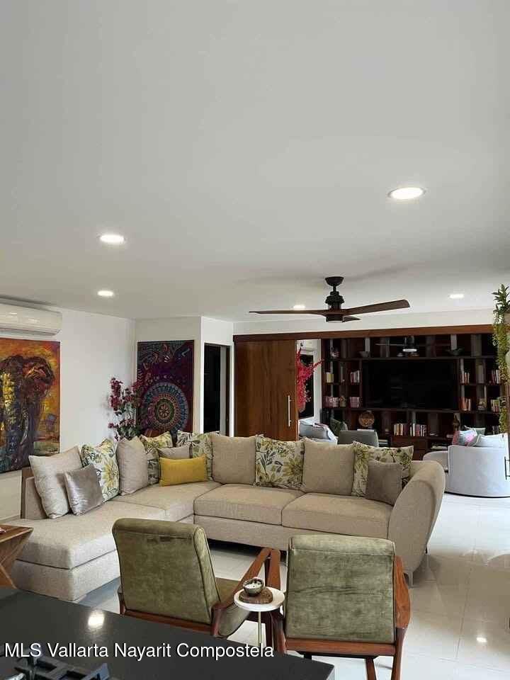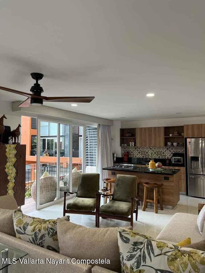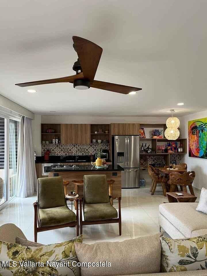 Disfrute de un espacio funcional y bien iluminado en el codiciado desarrollo Zoho Skies, Torre 2. Esta propiedad cuenta con un diseno arquitectonico limpio y moderno con acabados de parota. La distribucion interior se caracteriza por una sala de estar de concepto abierto que se integra a la perfeccion con una cocina de alto contraste, con encimeras oscuras y griferia de calidad profesional. Los pisos en tonos neutros y las paredes blancas nitidas maximizan la luz natural, mientras que la iluminacion empotrada y los ventiladores de techo garantizan un clima agradable en cada habitacion. Los techos altos y los pisos de porcelanato de gran formato brindan una estetica refrescante, perfecta para el clima costero de Puerto Vallarta.