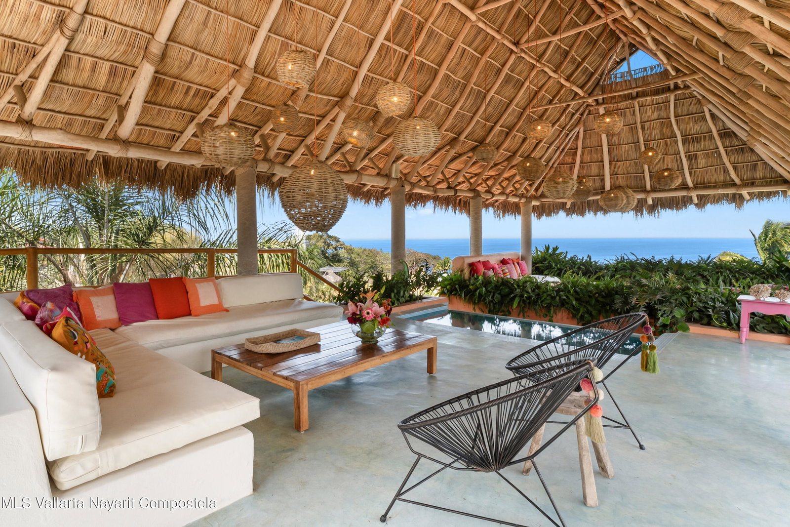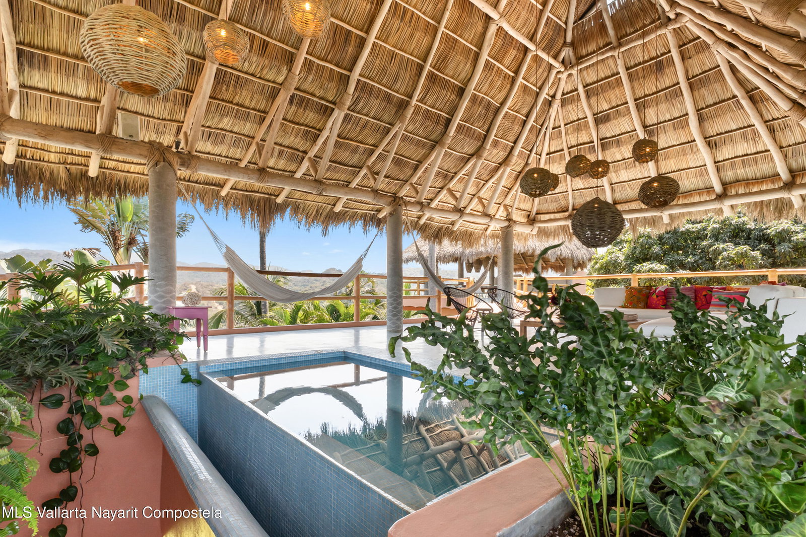 This unique villa with 360 degree views and its own lush garden, features four beautifully decorated bedroom suites, a swimming pool, a tree-top hot-tub with ocean views, and a Mexican-style open air living area with a rooftop living room and kitchen/dining room dramatically linked by a bridge. This property has views not only of the ocean and coastline but also of the lush foothills of the Sierra Madre and the energetic town of Sayulita. Each of the colorful accommodations has its own bathroom with shower, king size bed, fan, a-c and indoor and outdoor sitting areas. All rooms share views of the walled garden, pool, town, and surrounding hills.